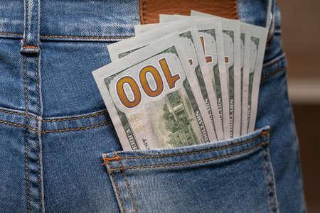 Money in the pocket of jeans. A hundred-dollar bill in the back pocket of his jeans. Pocket money, corruption, cash.