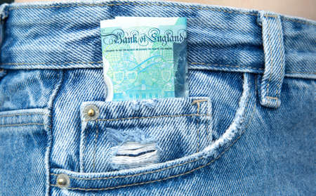Jeans with British pound money. United Kindom bills in the pants pocket for commerce concept.