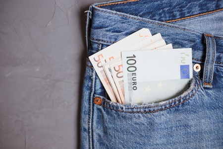 Moscow, Russia - 08 30 2018: Money financial concept. Euro banknotes in a pocket of blue jeans on gray background.