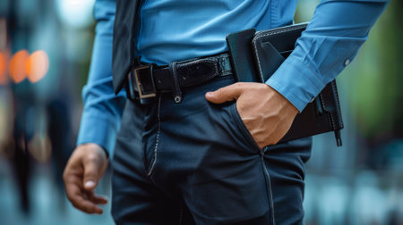 A close-up shot presents a person in a formal suit, with a smartphone partially visible in the pocket. The image features a muted color palette, emphasizing the texture of the fabric. The composition suggests a professional environment or a moment of discretion. Suitable for commercial or editorial applications related to business or technology.