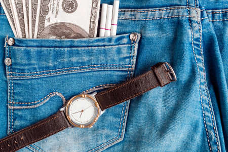 Old Vintage Wrist Watch on Blue Jeans Background and one hundred dollar bills in back pocket. close up