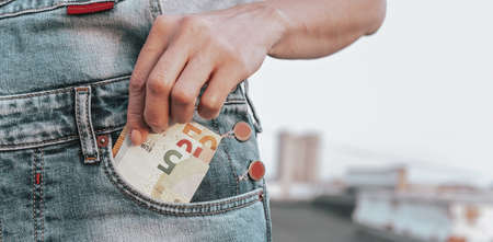 WEB banner format. A womans hand takes out euro from her jeans pocket. The concept of finance, savings, financial expenses. Close-up. Copy space