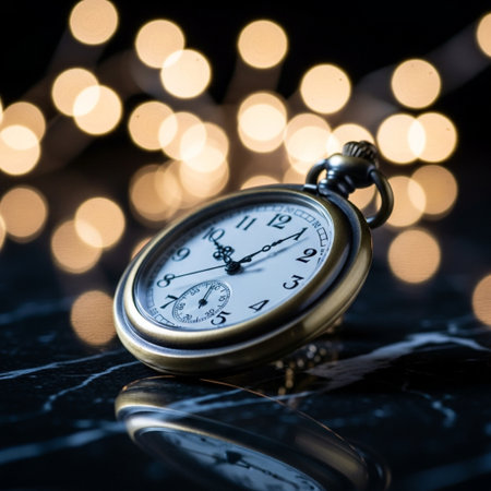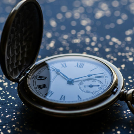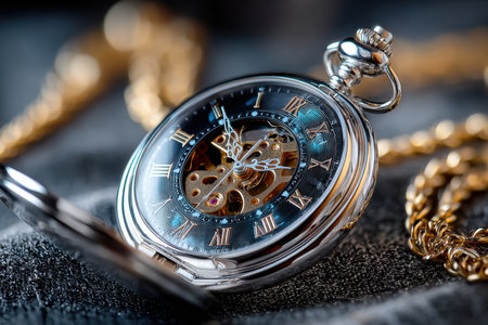 A silver pocket watch with visible gears and a gold chain rests on a dark surface