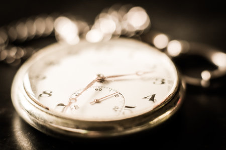 Vintage pocket watch is telling time with two other similar watches out of focus in the background
