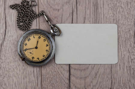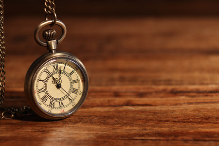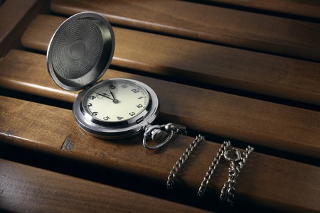 Pocket watch against a rustic wooden background Vintage Retro Filter.