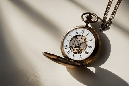 A beautifully crafted vintage pocket watch hangs elegantly against a soft bokeh background, capturing the essence of timelessness and nostalgia in an artistic display.
