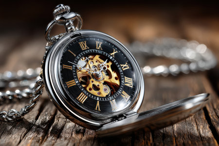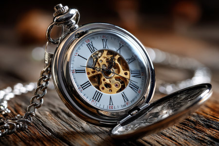 An antique pocket watch, featuring visible gears and intricate details, rests on a weathered wooden surface Its silver case and chain add to the vintage aesthetic