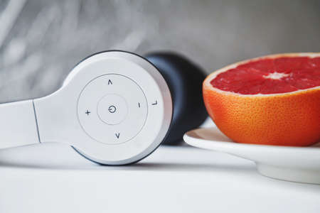 Close up composition of white minimalist headset and half of fresh red grapefruit on a small white plate with blurred background