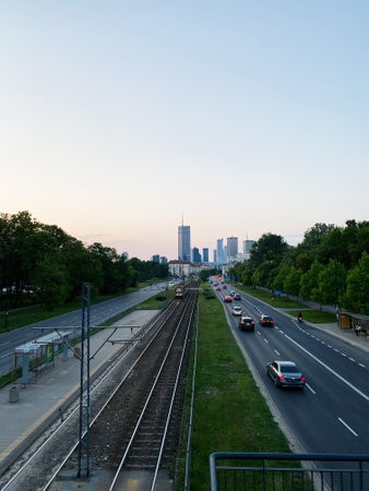 Warsaw, Poland city view featuring a railway, road, green spaces, and urban skyline at sunset