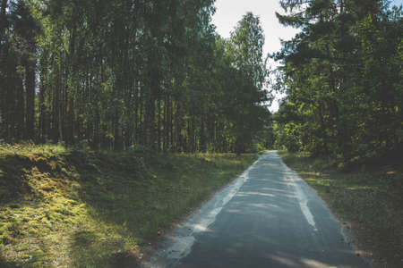 Aerial shot of car road in the forest on a sunny spring day, top view