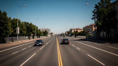 A vibrant street scene showcasing a mixture of urban architecture, lush trees, and moving vehicles under a bright sky. Perfect for travel themes.