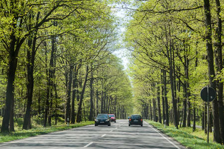 GERMANY - AUGUST 2015:View from the car window. The Autobahn among the green forest, cars on the road. Road sign. High quality photo