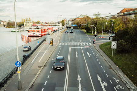 Prague, Czech - November 2022. Dvorakovo road near Vltava river. Autumn season