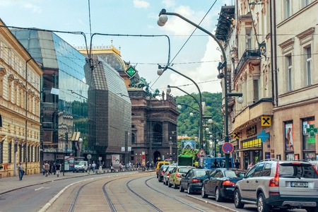 Traffic and parked cars on the Hybernska street in Prague, Czech