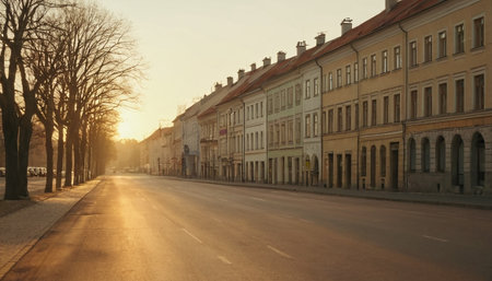 An empty cobblestone street stretches between rows of tall classic European buildings under a twilight sky. The quiet urban scene captures the serene atmosphere of a city at dawn or dusk with streetlights beginning to glow.