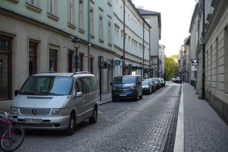 Poland, Krakow 20.04.2020: Empty, deserted streets of old city of Krakow in morning light during coronavirus pandemic. No tourists, closed restaurants and shops. Spring blue sky. Closed borders