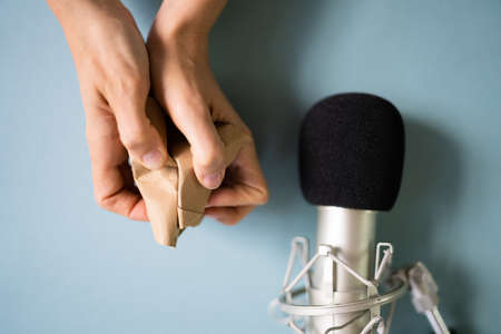 Close-up of unrecognizable man using microphone while recording podcast in studio