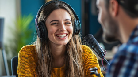 Young woman podcaster in headphones recording content with colleague talking to microphone in broadcast studio together