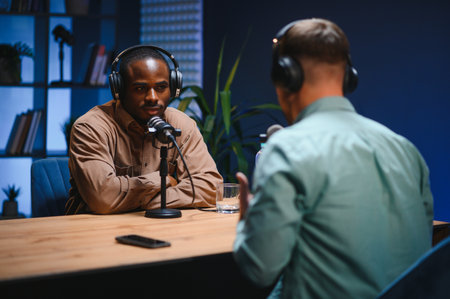 Young smiling African American male host or radio presenter in headphones sitting by desk and talking in microphone with guest