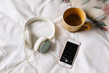 Cozy bed, coffee, headphones, and a podcast set a relaxed vibe.