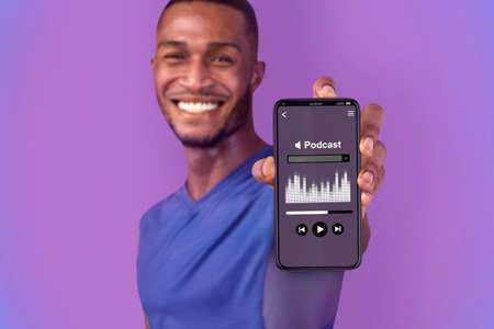 Happy Young Black Man Showing Smartphone With Music Podcast Interface On Screen