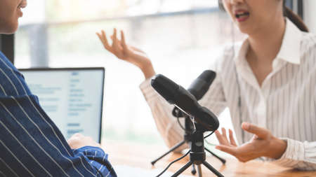 Top view of two radio hosts, young man and woman discussing various topics while moderating a live show in studio
