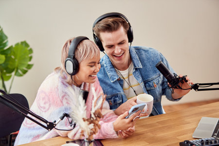 serious radio host in headphones pointing at mobile phone in hands of positive indian colleague in yellow jumper near coffee to go and microphones in broadcasting studio