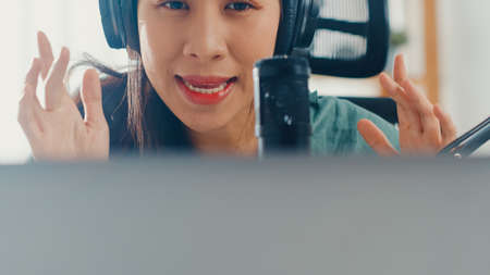 Happy asia girl record a podcast on her laptop computer with headphones and microphone talk with audience at her room. Female podcaster make audio podcast from her home studio, Stay at house concept.