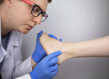 An orthopedic surgeon examines a woman's leg. Foot pain, tendon sprains, inflammation, flat feet, bursitis, fasciitis. Foot disease treatment concept. The doctor examines
