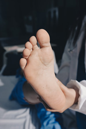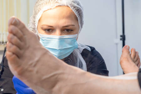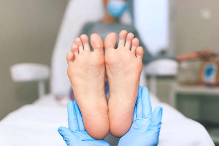 Foot doctor examining bare feet, Toenails on a woman's feet,
