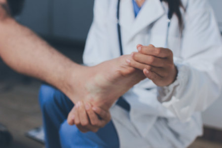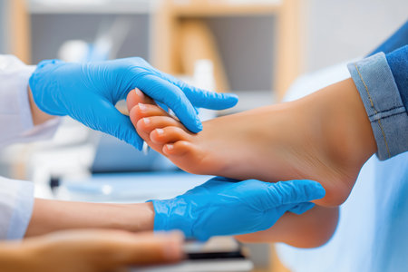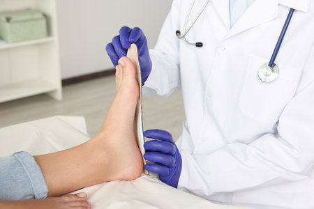A doctor or podiatrist wearing blue medical gloves gently holds and examines the foot of a patient during a consultation for a foot-related health issue.