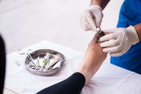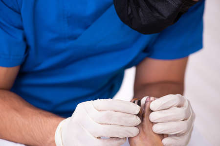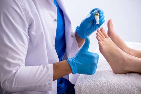 Dermatologist is holding foot of woman with damaged thumb in his hands in rubber gloves in clinic. Treatment of fungal nail infections concept.