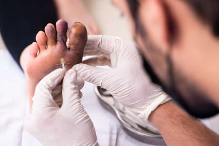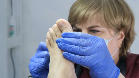 Gloved doctor examines patients skin on leg between toes. Skin fungus on the feet concept