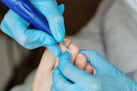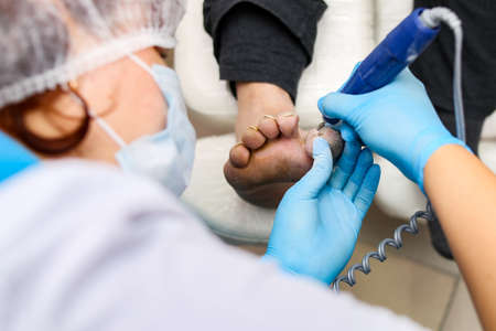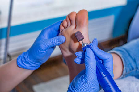 Podology treatment. Podiatrist. Doctor removes calluses, corns and treats ingrown nail. Hardware manicure. Health, body care concept. Selective focus.Podology pedicure. Pedicure without gel or varnish