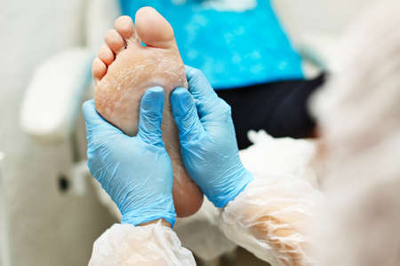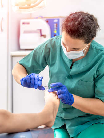 Medical pedicure procedure using special instrument with blade knife holder.Professional pedicure using dieffenbach scalpel.Patient visiting podiatrist.Foot treatment in SPA salon.Podiatry clinic.
