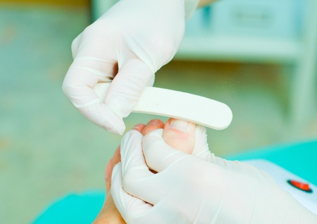 Disease thickening of the toenail, cutting off the excess layer with a pedicure apparatus.
