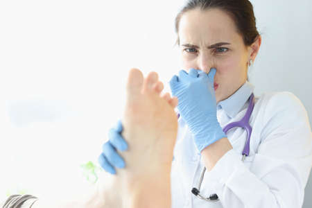 Doctor dermatologist holding patients foot and covering nose with hand. Bad foot odor concept