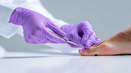 A skilled professional performing a detailed pedicure treatment, showcasing careful attention to toenail grooming. The image highlights the importance of hygiene and aesthetics in foot care.
