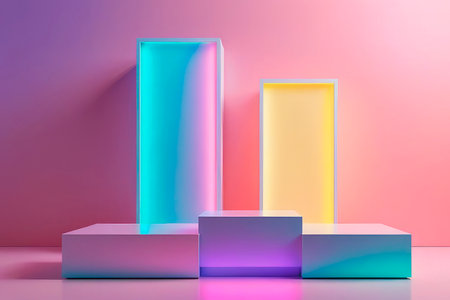 Empty podiums for product placement in the style of minimalism with neon light glow on pastel background. Trending color concept of the year 2024. Abstract iridescent and geometric spectral chromatic liquid.