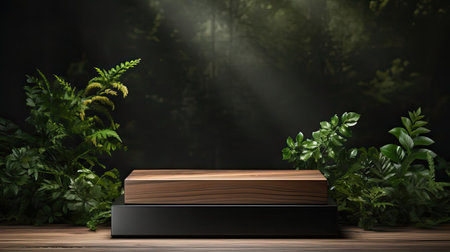 podium for product stand with plant background and cinematic light, front view, minimalist design