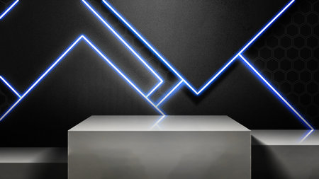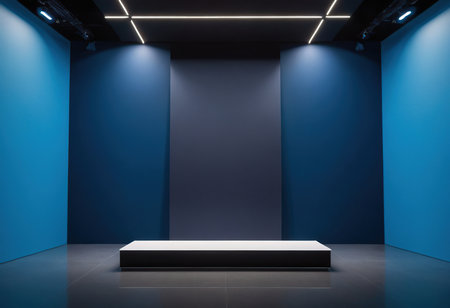 Minimalist stage or podium display with a blue light effect on a black background. Product presentation, mockup, copy space, and template
