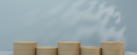 3D rendering, Brown wood podium, Cosmetic display stand on blue background. Abstract stone platform podium product presentation backdrop.
