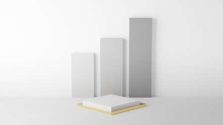 3D of square podium white and gold colour on with white graph and wall. 3D Rendering illustration. Product presentation minimal. Empty geometric shape. Mock-up showcase for product