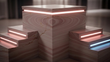 A minimalist geometric display pedestal with soft, warm ambient lighting against a dark, out-of-focus background.