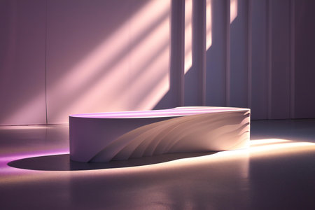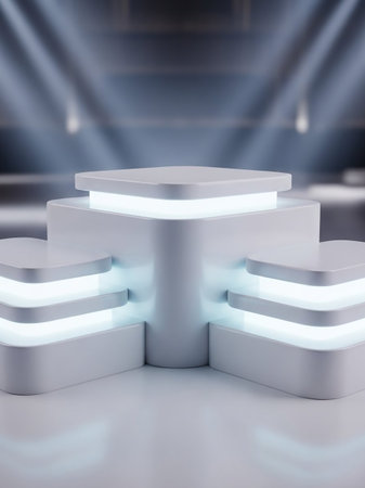A sleek, modern white podium with rounded edges features integrated glowing LED lights and is illuminated by dramatic spotlights from above.