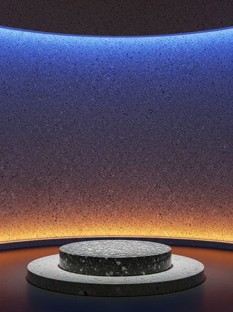 A round terrazzo pedestal sits on a circular base against a curved, textured wall lit by a gradient of blue and orange light.