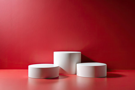 Red background. three white podium minimalist mock up scene for cosmetic or another product, 3d rendering