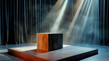 An illuminated podium stage is presented against a textured background. The scene features a concentrated overhead light beam casting shadows. Warm tones and textures define the setting. This image is suitable for commercial uses such as advertising, showcasing, and promoting products.