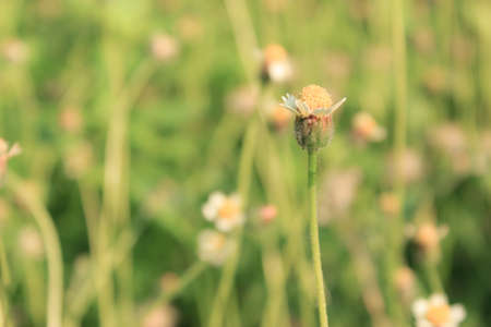 Small yellow flowers, soon to bloom on the green blurry background. Closeup photo of the plants in a sunny summer day