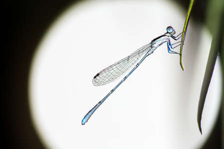 Blue damselfly at night, backlit with a big white light which looks like the moon